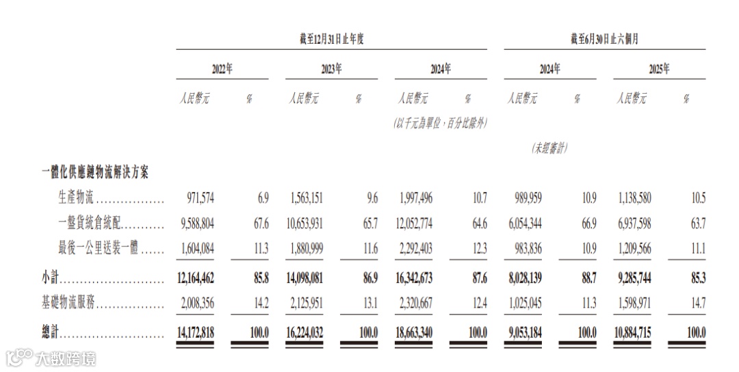 收入构成中,安得智联的收入主要来自于一体化供应链物流解决方案。招股书显示,2022年、2023年、2024年及2025年上半年,安得智联来自一体化供应链物流解决方案的收入分别为121.64亿元、140.98亿元、163.43亿元及92.86亿元,占总营收的比例分别为85.8%、86.9%、87.6%及85.3%。其中,一盘货统仓统配环节在各期营收分别占总营收的比例为67.6%、65.7%、64.6%及63.7%。