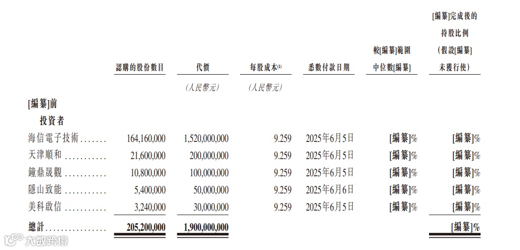 顺和、钟鼎晟观、隐山致能、美科启信认购,本轮融资额度达19亿元,其中海信投资15.2亿元,获得绝大部分投资份额,天津顺和、钟鼎晟观、隐山致能、美科启信分别投资2亿元、1亿元、5000万元和3000万元。