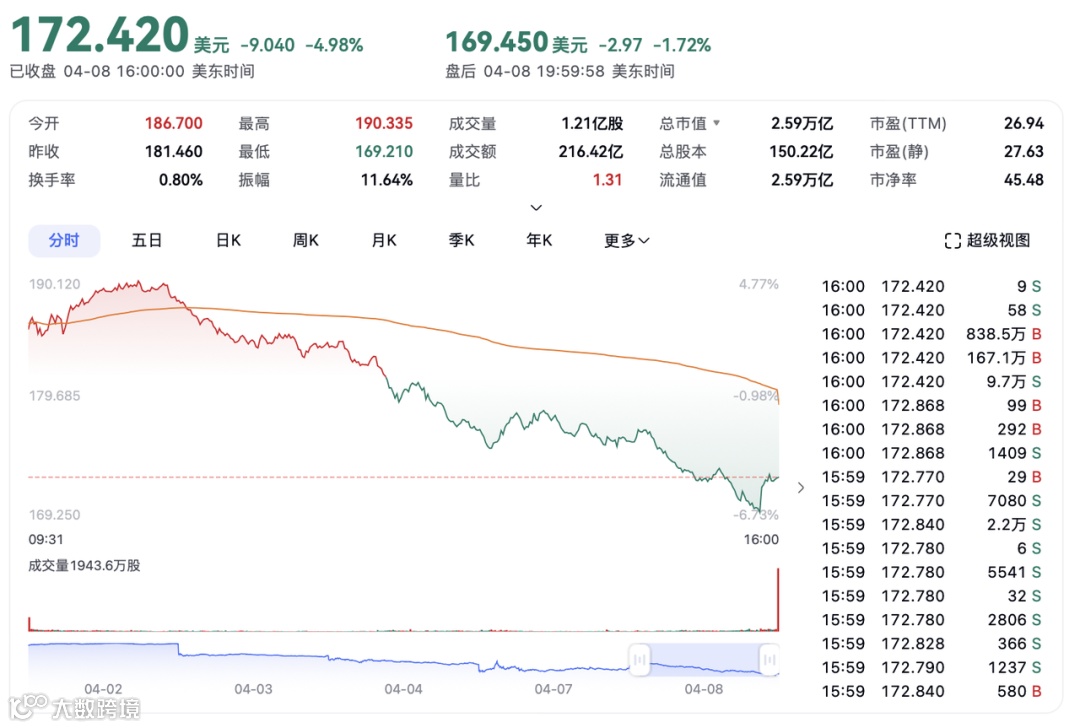 很显然,这让当下的苹果陷入了僵局。截至4月8日收盘,苹果公司下跌4.98%,报172.42美元/股,股价连续四天大跌。