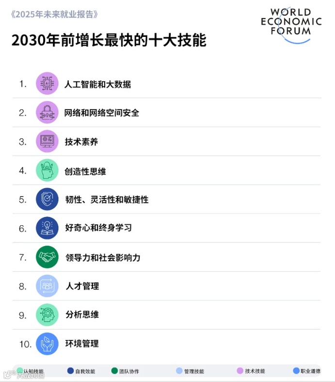 世界经济论坛《2025年未来就业报告》总结了2030年前增长最快的十大技能: