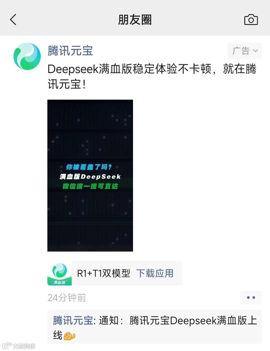 这一次,微信作为王牌渠道,为元宝提供了强大的流量支持。搜一搜中显示下载元宝(体验DeepSeek-R1)跳转链接;朋友圈信息流广告、公众号文章底部、小程序开屏页都有元宝的推送;还有微信九宫格入口嵌入。