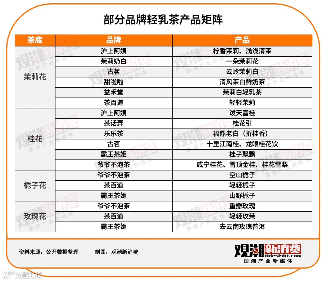当下的鲜奶茶原料中,桂花、茉莉花、栀子花、兰花都是各家鲜奶茶的“熟面孔”。各有特色的名字之下,是相似的产品本质。