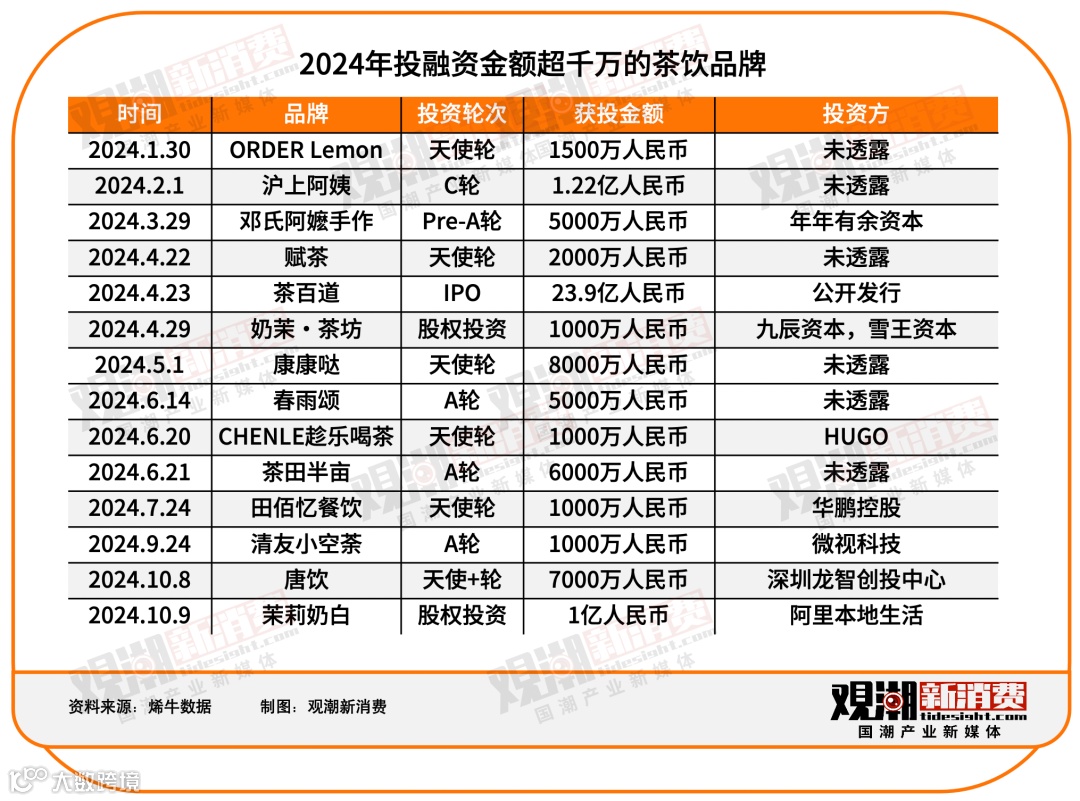 新中式茶饮品牌「茉莉奶白」近日完成近亿元融资,由阿里本地生活领投。据观潮新消费(ID:TideSight)不完全统计,除年初沪上阿姨递交招股书前机构突击入股外,这是今年以来新茶饮领域唯一一笔亿级融资。