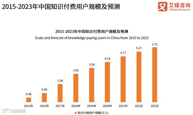 》显示,2022年中国知识付费用户数量约5.27亿人,市场规模约1000亿元,预计2023年市场规模将突破1800亿元。