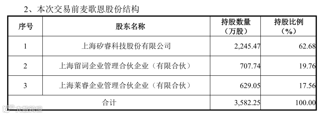 公告显示,本次交易前麦歌恩大股东为矽睿科技,持股比例为62.68%;上海留词、上海莱睿两家员工持股平台分别持股19.76%、17.56%。