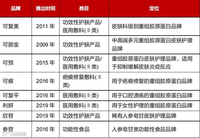 2、巨子生物:提高重组胶原表达率,实现重组胶原从实验室到量产工厂的迁移,通过打造医用敷料、功能护肤品等终端产品,来进行重组胶原的市场教育。