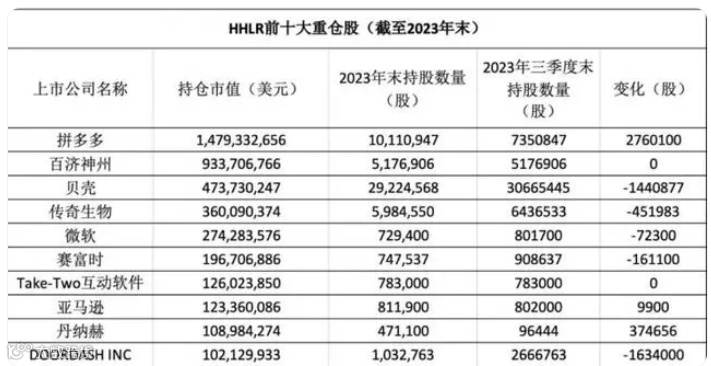 据披露的持仓情况,截至去年底,HHLR前十大重仓股为拼多多、百济神州、贝壳、传奇生物、微软、赛富时、Take-Two互动软件、亚马逊、丹纳赫和DOORDASHINC,中概股持仓市值占比超过70%,占据主导地位。