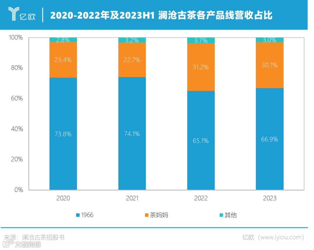 澜沧古茶1966为经典普洱茶产品,目标对象是普洱茶爱好者及专业茶友。作为澜沧古茶最大的收入来源,2020-2022年以及2023年上半年,其收入分别为2.99亿元、4.14亿元、3.01亿元和1.55亿元,占总营收的73.8%、74.1%、65.1%和66.9%。