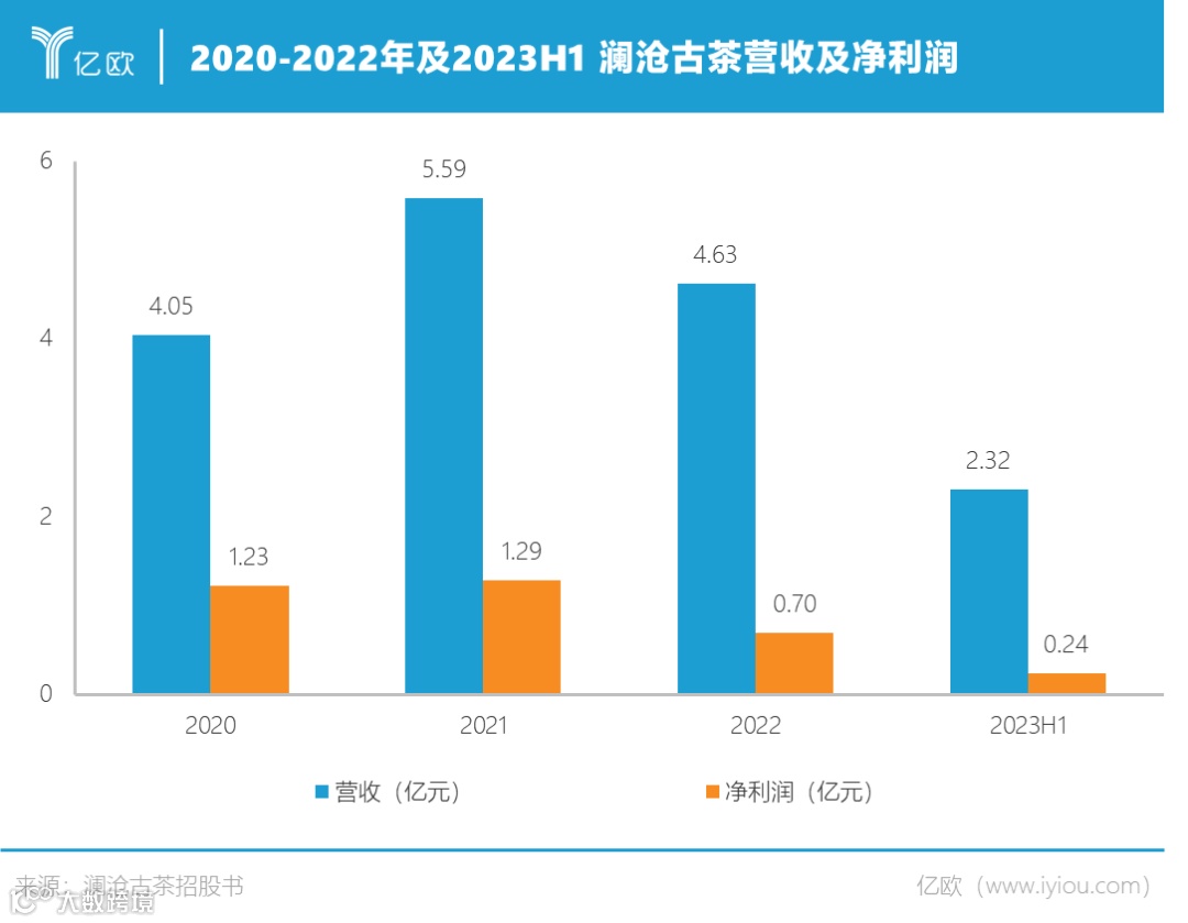 招股书显示,2020-2022年,澜沧古茶的营收分别为4.05亿元、5.59亿元和4.63亿元,净利润分别为1.23亿元、1.29亿元和0.70亿元。今年上半年,澜沧古茶的营收从2022年同期的2.28亿元微增至2.32亿元,净利润从2022年同期的0.30亿元降至0.24亿元。