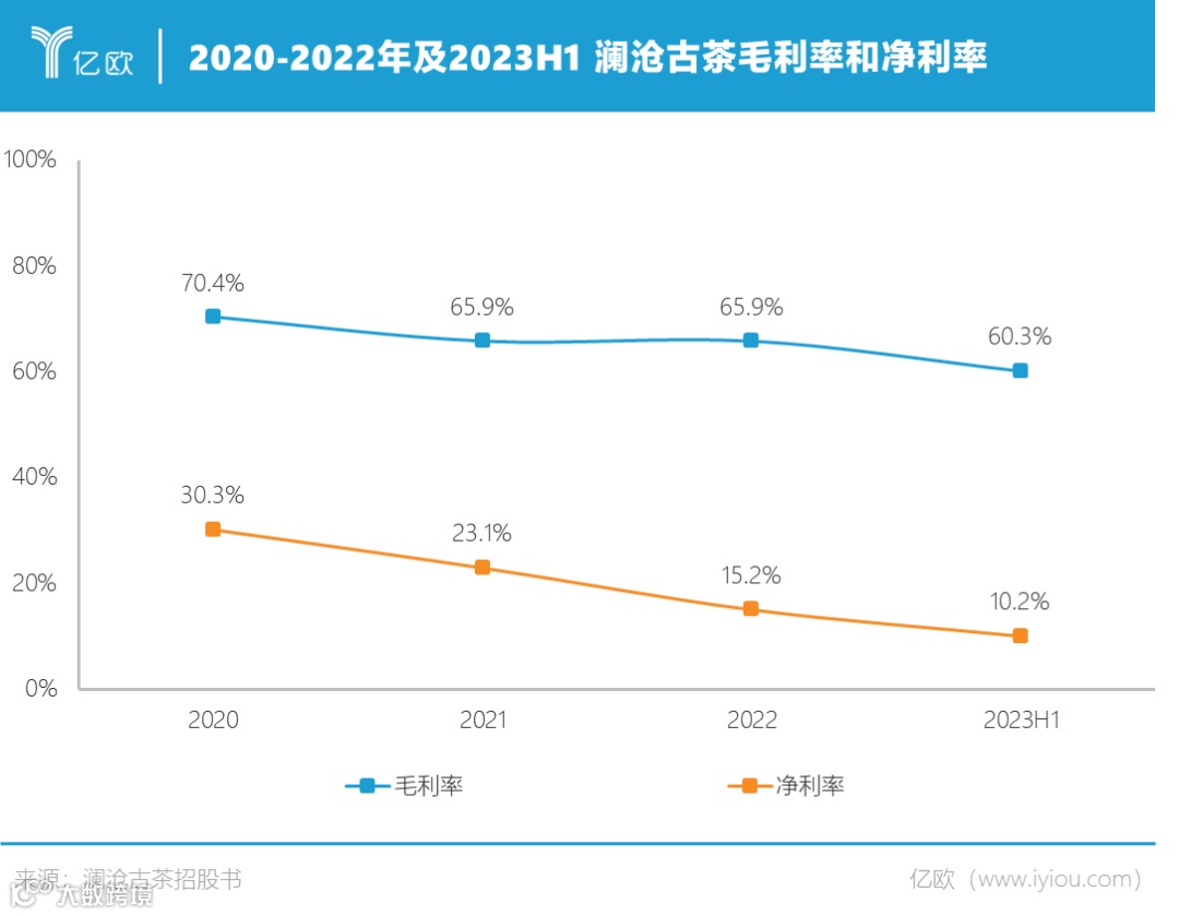 可以看到,近年来澜沧古茶的毛利率和净利率持续下跌。招股书显示,2020年至2023年上半年,澜沧古茶整体毛利率分别为70.4%、65.9%、65.9%和60.3%,同期净利率分别为30.3%、23.1%、15.2%和10.2%。