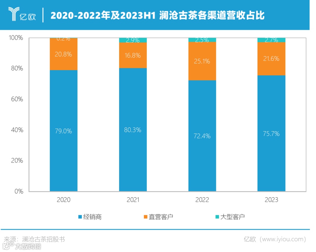 和大多数传统茶企一样,澜沧古茶的销售极度依赖线下经销商。招股书显示,报告期内经销商对公司收入贡献在7成以上;高峰时期的2018年,公司的经销商曾多达753家,年贡献收入占比近9成,而如今仅剩下了500余家。