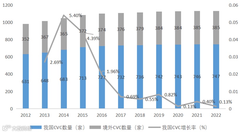 2012年至2022年,CVC机构的设立数量整体呈现稳步增长态势,从2012年的631家发展到2022年的747家年复合增长率为1.70%。CVC机构的投资事件数量从2012年的百余起增长到如今的千余起。