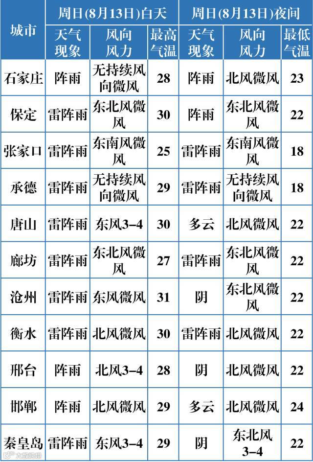 预计明天(8月12日),河北大部地区最高气温有所下降,北部地区设区市(张家口、承德、唐山、秦皇岛)最高气温为28℃至32℃,中南部地区各设区市为31℃至34℃;