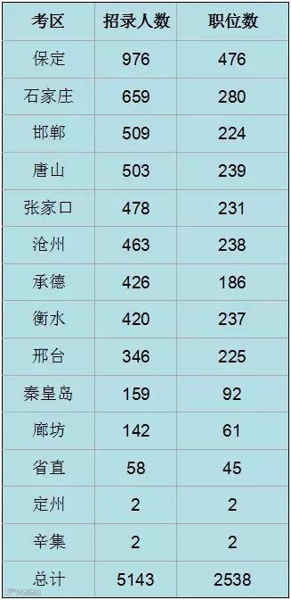 从各考区榜单可以看出,保定市招录人数远超其他市,以976人、476个职位蝉联“冠军”宝座,石家庄紧随其后,招录659人、280个职位,而第三名是2016年的“亚军”邯郸市,招录509人、224个职位。今年省直机关仅招录58人。