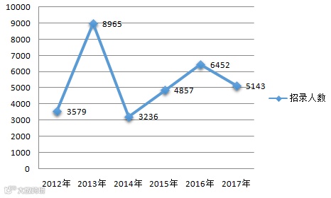 从近5年来看,河北公务员考试招录人数走向从大起大落逐步走向平稳,2013年出现高峰值,达8965人,而2012年、2014年都是在3000多人,今年招录5143人,与去年相比呈现出一定降幅,但平稳趋势较为明显。