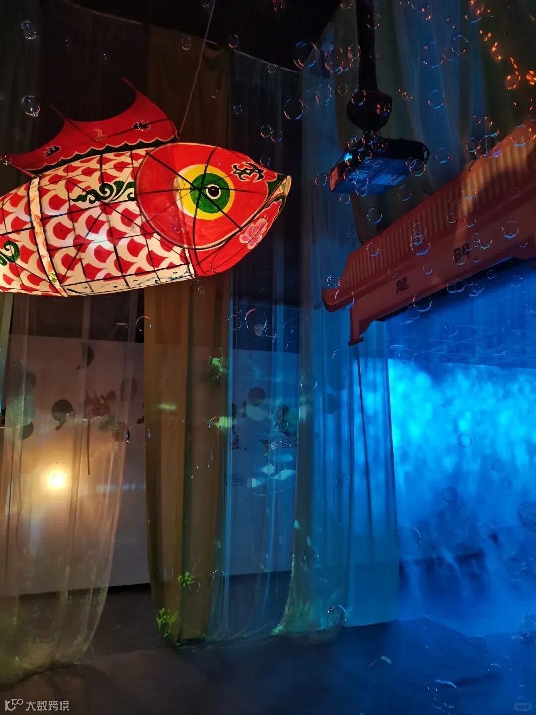 展览分为“觉、转、通、鱼、愿”五个独立的主题单元。在这里可以欣赏到炫酷的灯光、烟雾缭绕的“神树空间”,聆听雷声轰动,树林震颤,盘坐于蒲团,沉浸思考自然与人;歙县非遗鱼灯在光影中穿梭跳跃,运河文化厚重绵长,拉动每一块地标牌,看燃灯塔亮起跨越时空的光芒,还能通过数字打卡装置打印“运河专属签名”。
