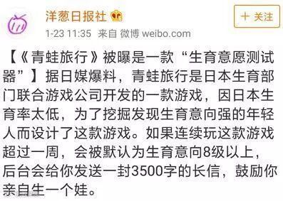 游戏《旅行青蛙》正风靡网络,但近日,其被爆是日本的一款 生育意愿测试器 。
