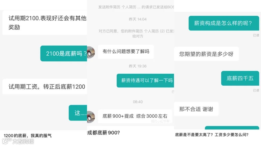 “成都的人都太懒了,一到下班、周末就没人了,又没有能力又没有意识,完全不能和北京比,连轴转都是主动的。”我作为打工人在旁边默默干饭,并开始反思我是不是也“意识不够”,直到后来我在招聘平台上意识到他所提供的这份工作薪资待遇才4-6k。
