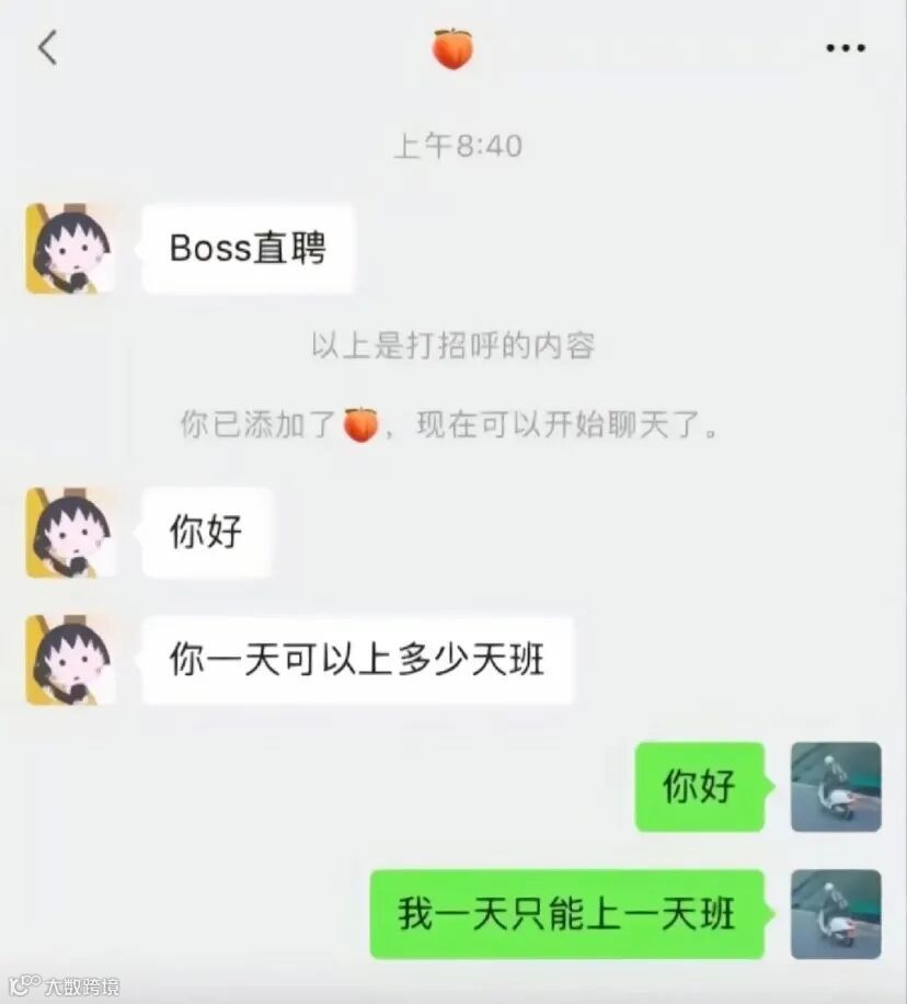 崩溃的还有一种表现是发疯,网络上遍地的发疯文学可以证明这个时代在某种程度上的病入膏肓,当代年轻人擅长践行“以荒诞对抗荒诞,用魔法打败魔法”的消极反叛。于是,“找工作哪能不发疯”的精神状态开始蔓延,Boss直拒变成Boss直乐。只要有当牛做马的觉悟,PUA就永远追不上你,只要放弃互相画饼,主打一个真诚,就能在居高临下的招聘市场反客为主。