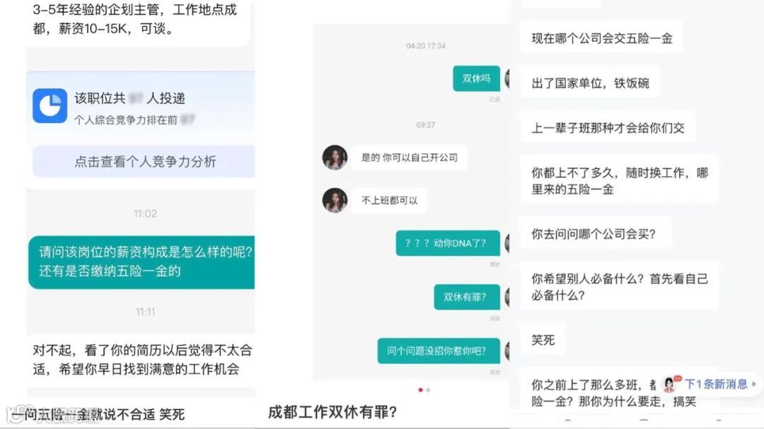 “熟练”的核心层面在于,这些用工单位并非小心翼翼地在违法边缘试探,他们能搬出“这里所有公司都是这样”的挡箭牌,毫不心虚地说服求职者、也说服了自己。“一起烂”不是什么堕落的沼泽,而似乎变成了成都给他们的底气。如果追问一下具体情况,或者稍加反驳其不合理性,大概率就会被婉拒“不好意思,您不适合这个岗位”,或者被阴阳怪气,甚至被气急败坏地质问“配不配”。