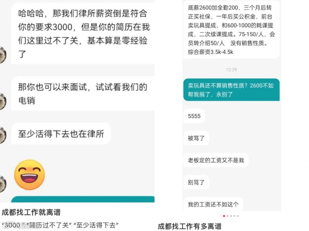对于许多在成都经历过求职季的毕业生而言,最现实的妥协不是大小周、单双休,也不是薪资区间的下限,而是最终回应中国平安递来的橄榄枝:“摆烂了,销售就销售吧”。