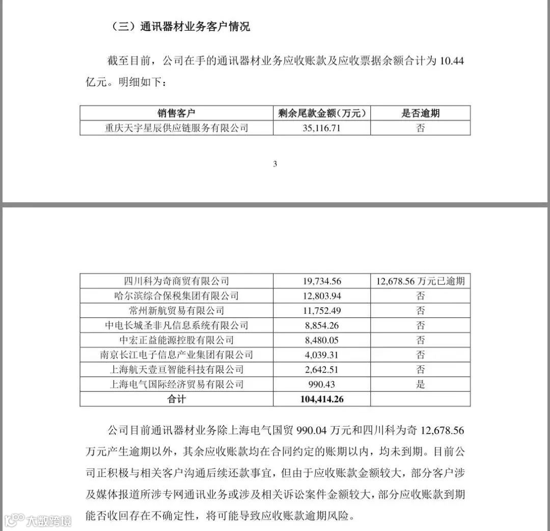 另外,江苏舜天面临的风险不止如此,除了这两笔逾期款外,彼时它共有10.44亿元的营收账款和票据,也都是通讯器材业务方面的,共涉及9家公司。虽然,当时大部分还未逾期,但也够呛能收回,因为这9家公司中,有多家被牵连进了专网通信案。