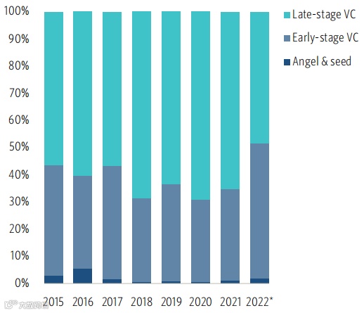 天使&种子轮、早期、后期交易价值占比,数据来源:Pitchbook