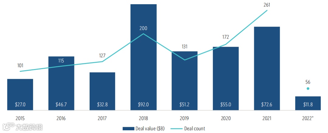 同时,单笔价值超过1亿美元的大额交易也显著放缓。2022上半年,大中华区仅产生56笔大额交易,远低于美国同期的356笔和去年共261笔的平均水平。