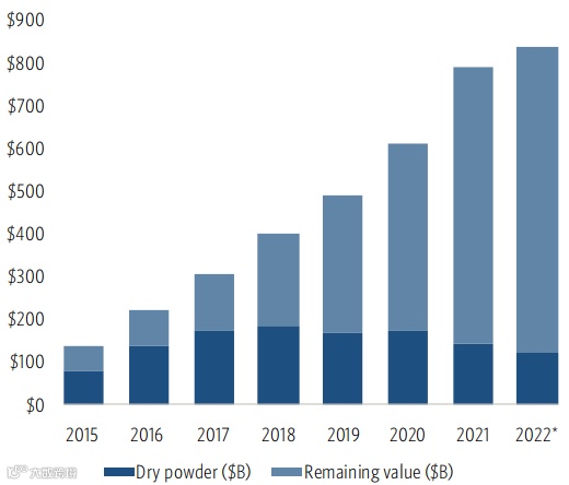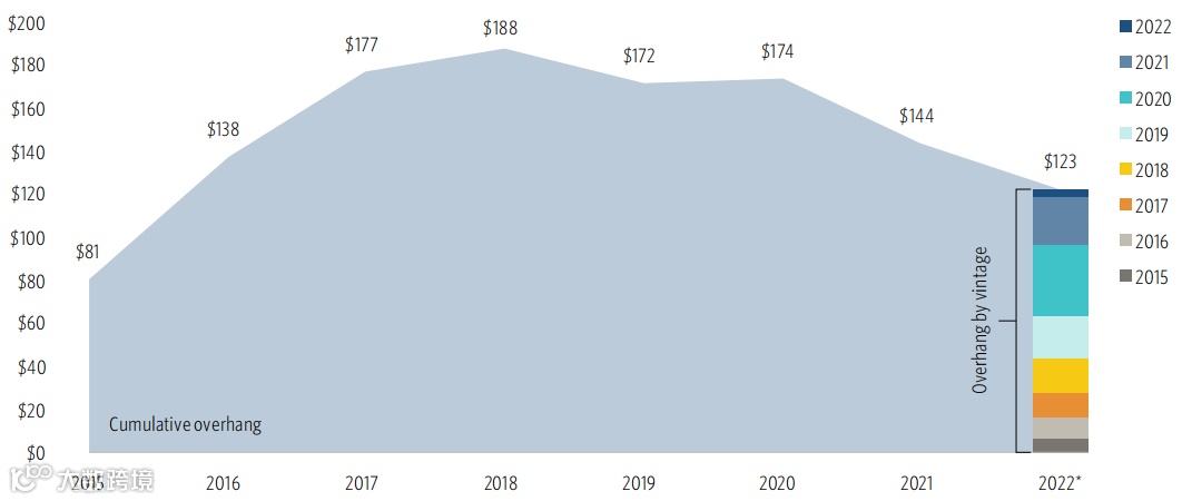在募资活动有望创下历史新低的2022年,大中华区风投活动的可投资金(dry powder)降低至2016年以来的最低水平。自2018年达到1880亿美元的高点以来,可投资金在近4年内持续下跌,并在2022年降至1227亿美元。