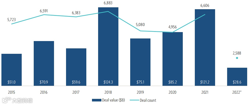 大中华区2015-2022上半年风投交易数量、价值(十亿美元),数据来源:Pitchbook