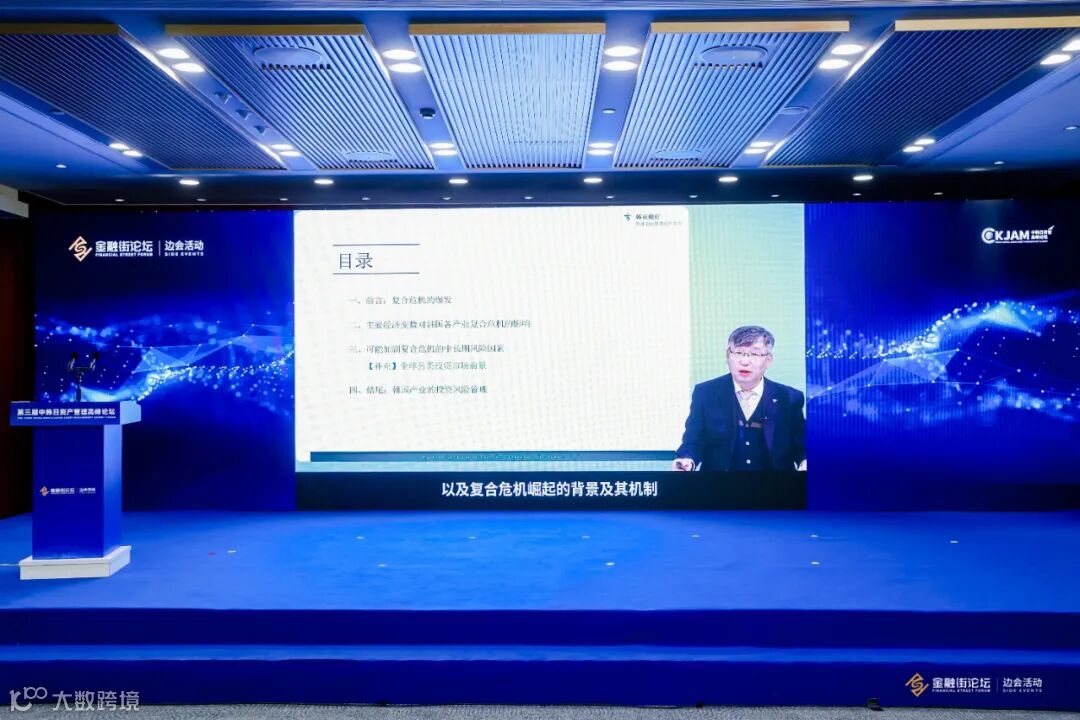 韩亚金融集团经济研究所所长郑仲镐针对“多重危机叠加对韩国产业的投资风险”发表主题演讲,