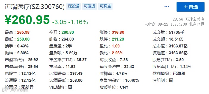 继东方财富、爱美客、三安光电后,9月21日,医疗代表迈瑞医疗惨遭毒手,大跌7.21%。