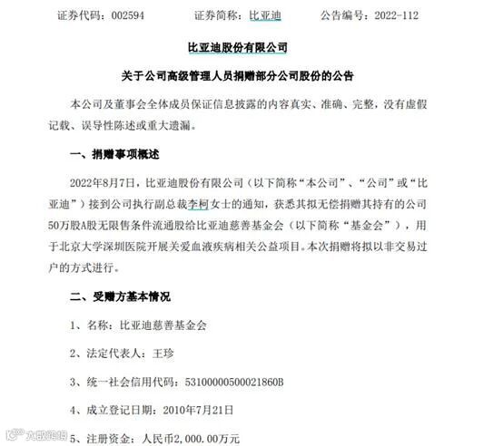 比亚迪8月7日发布的公告显示,公司接到执行副总裁李柯女士的通知,获悉其拟无偿捐赠其持有的公司50万股A股无限售条件流通股给比亚迪慈善基金会(以下简称“基金会”),用于北京大学深圳医院开展关爱血液疾病相关公益项目,具体应用于血液疾病的预防、诊治和血液科学术研究、人才引进(领军人才)和骨干人才的培养等。本次捐赠将拟以协议转让(非交易过户)的方式进行。