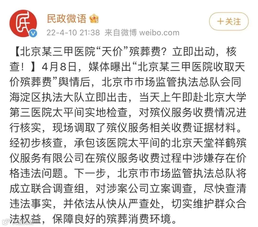 据民政部新闻办官方微博@民政微语 4月10日晚通报,4月8日,媒体曝出“北京某三甲医院收取天价殡葬费”舆情后,北京市市场监管执法总队会同海淀区执法大队立即出击,当天上午即赴北医三院太平间实地检查,对殡仪服务收费情况进行核实,现场调取了殡仪服务相关收费证据材料。