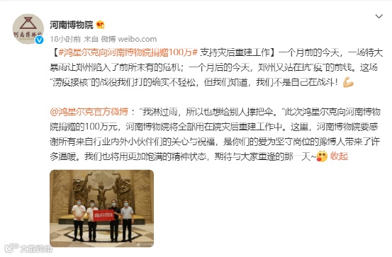 另外在去年8月份,鸿星尔克再度低调捐款。据河南博物院发布的微博,鸿星尔克向河南博物院捐赠100万,支持灾后重建工作。文中提到,鸿星尔克表示“我淋过雨,所以也想给别人撑把伞。”此次鸿星尔克向河南博物院捐赠的100万元,河南博物院将全部用在院灾后重建工作中。