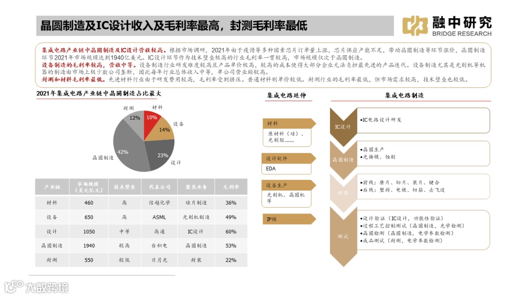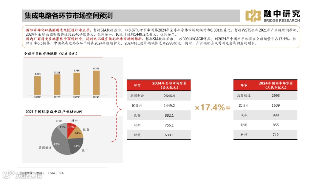 集成电路各环节市场预测。集成电路产业链供应商以海外为主,国内均有对应技术模仿者。国际市场仍以晶圆制造及IC设计为主导。国内厂商将更多地聚焦于IC设计中,同时维护低毛利率市场。