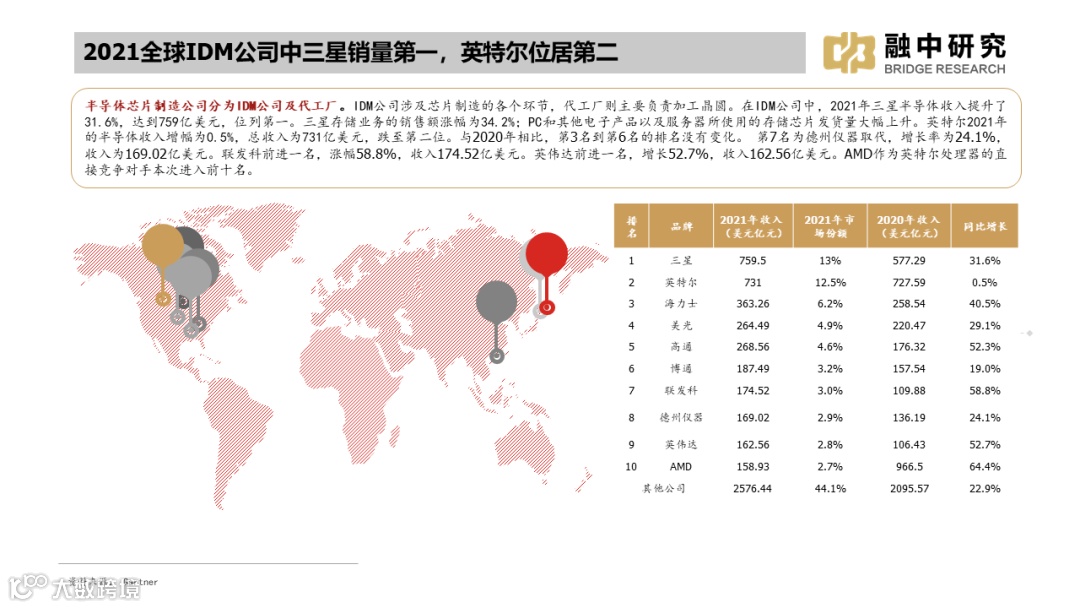 2021全球IDM公司中三星销量第一,英特尔位居第二。半导体芯片制造公司分为IDM公司及代工厂。IDM公司涉及芯片制造的各个环节,代工厂则主要负责加工晶圆。在IDM公司中,2021年三星半导体收入提升了31.6%,达到759亿美元,位列第一。三星存储业务的销售额涨幅为34.2%;PC和其他电子产品以及服务器所使用的存储芯片发货量大幅上升。英特尔2021年的半导体收入增幅为0.5%,总收入为731亿美元,跌至第二位。与2020年相比,第3名到第6名的排名没有变化。 第7名为德州仪器取代,增长率为24.1%,收入为169.02亿美元。联发科前进一名,涨幅58.8%,收入174.52亿美元。英伟达前进一名,增长52.7%,收入162.56亿美元。AMD作为英特尔处理器的直接竞争对手本次进入前十名。