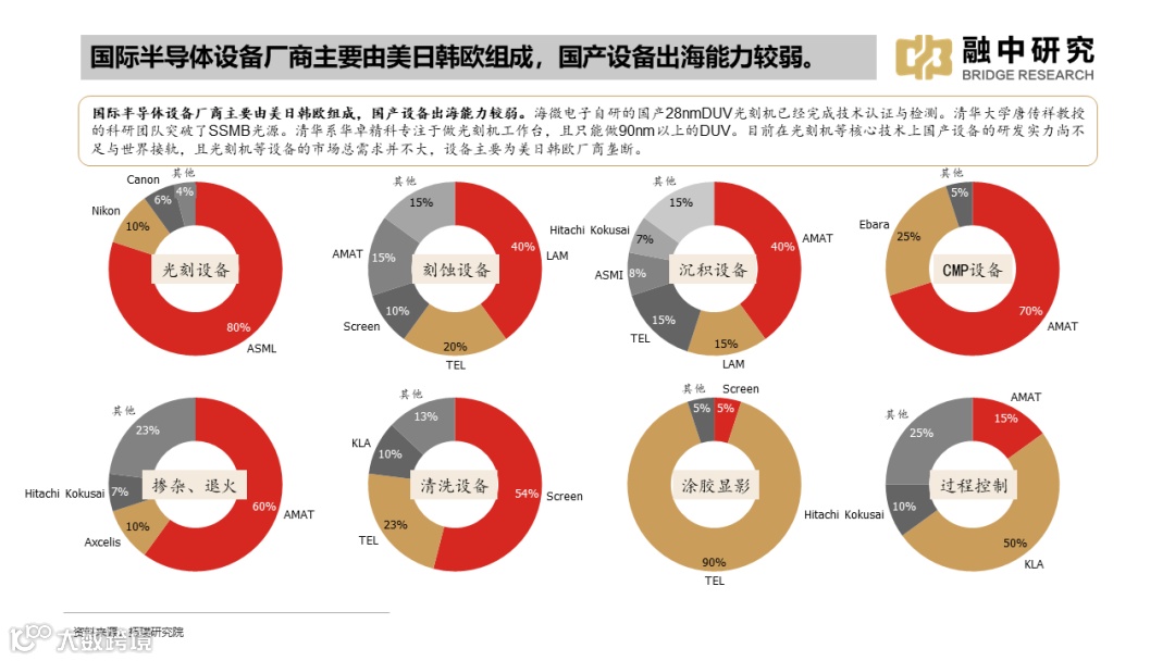 设备制造领域种类繁多,平均研发难度较高。半导体设备在几乎所有环节都有应用,种类复杂繁多。国际半导体设备厂商主要由美日韩欧组成,国产设备出海能力较弱。