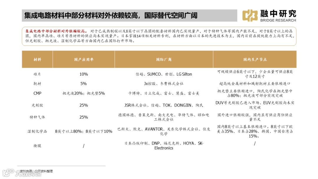 集成电路部分材料国际替代空间广阔。集成电路中部分材料对外依赖较高。对于已成熟制程以及8英寸以下晶圆的配套材料国内已实现量产,对于特种气体等国内产能不足,对于8英寸以上的晶圆,国内单晶硅、硅片等原材料的供应尚未实现量产。日本掌握14项相关材料专利,在材料方面以日本的先进技术为主,国内目前在提纯能力上尚有不足,但光刻胶、抛光液、湿制化学品等方面国内已在国际打开市场。