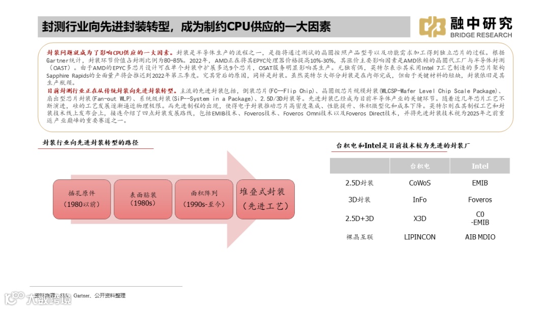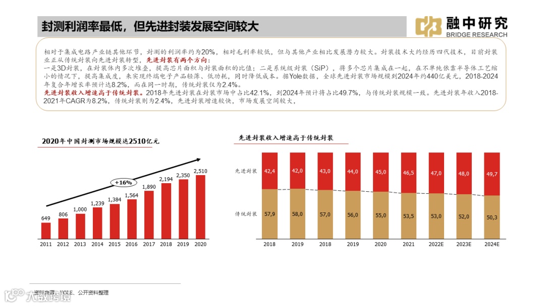 先进封装发展空间较大。封装是半导体生产的流程之一,是指将通过测试的晶圆按照产品型号以及功能需求加工得到独立芯片的过程。