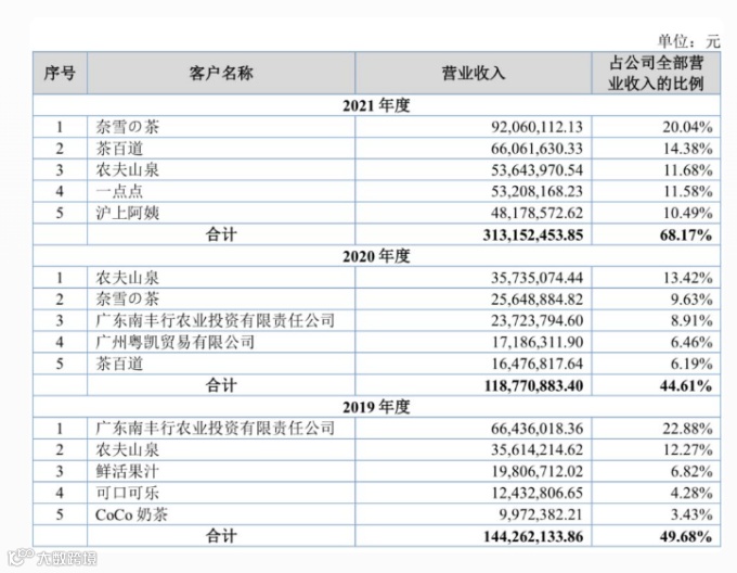 招股书显示,田野股份2021年前五大客户分别为奈雪的茶、茶百道、农夫山泉、一点点、沪上阿姨,此前,还是可口可乐、CoCo奶茶的供应商。