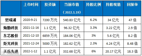从对华为哈勃投资成果统计看,5家IPO企业平均回报达到了16.9倍,并为哈勃投资带来超过63亿元账面收益。其中,公开信息显示2021年四季度哈勃投资已减持思瑞浦少量股份,套现6125万元,本钱已落袋为安。