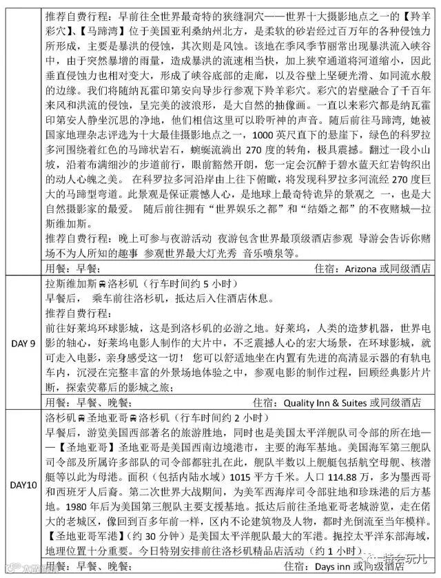 早餐:拉斯维加斯为打包餐盒,拉芙林,夏威夷为酒店外早餐。其他站均为酒店内早餐;