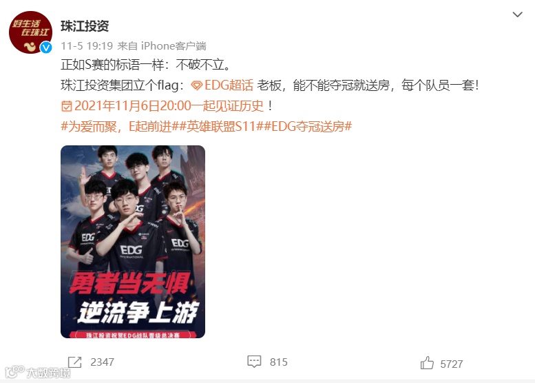 微博认证为广东珠江投资股份有限公司的珠江投资还在微博上高调表示,如果EDG能夺冠,那老板能不能送每个选手一套房?随后,珠江投资又表示:“我们的项目动作很快,珠江未来城!”