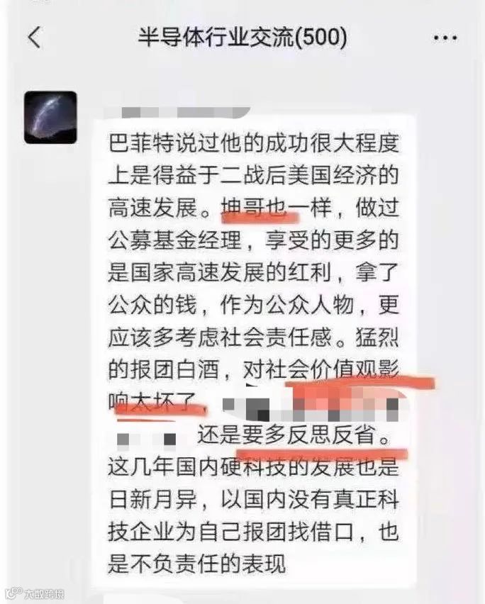在同样的群里,有分析师批评张坤称:“享受的更多的是国家高速发展的红利,拿了公众的钱,作为公众人物,更应该考虑社会责任感。猛烈抱团白酒,对社会价值观影响太坏了,还是要多反思反省。这几年国内硬科技的发展也是日新月异,以国内没有真正的科技企业为自己抱团找借口,也是不负责任的表现。”