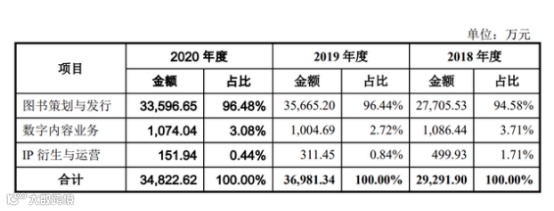 招股书显示,果麦文化有三大业务,分别为图书策划与发行业务、数字内容业务和IP衍生与运营业务。其中,图书策划与发行业务收入分别为2.77亿元、3.57亿元和3.36亿元,占比主营业务收入分别为94.58%、96.44%和96.48%,构成主营业务收入的主要收入来源。