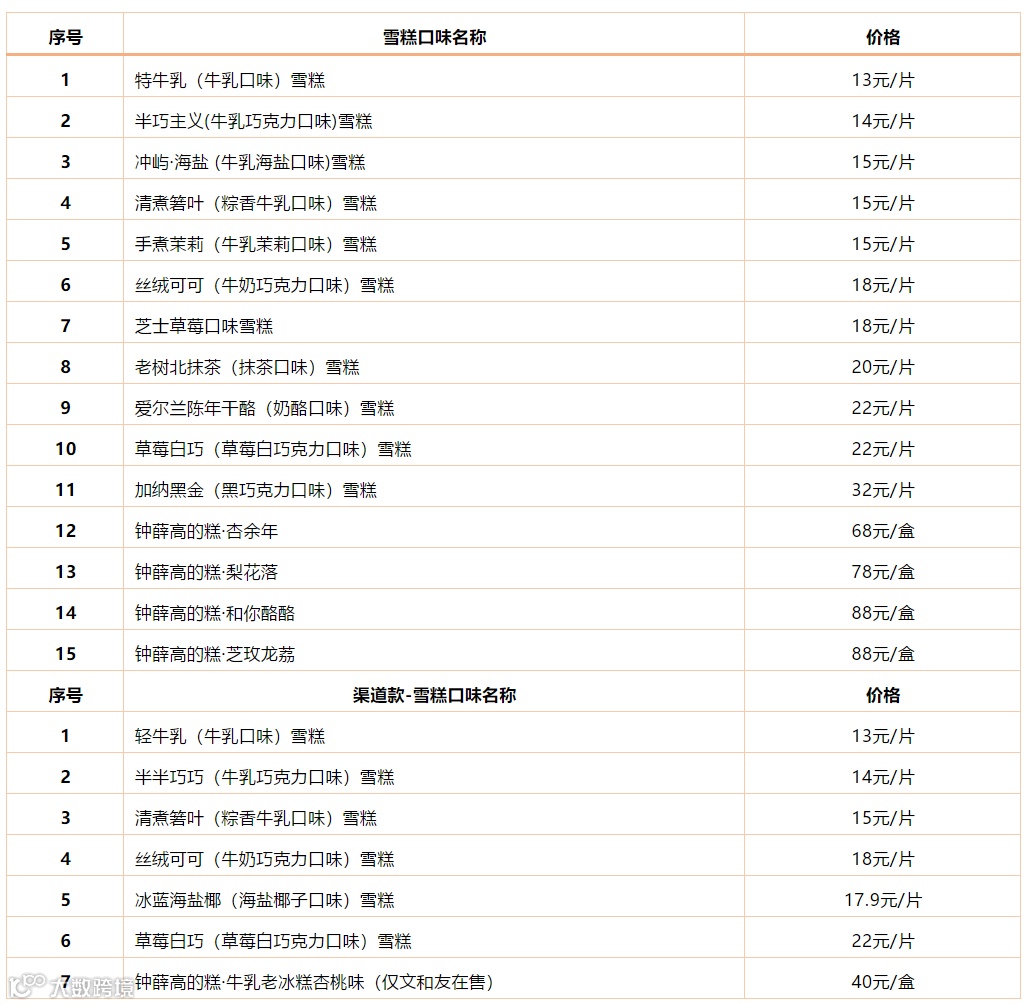 钟薛高最新的产品售价表显示,其售价最低的雪糕为13元/片。放眼国产雪糕市场,这个价格足以傲视群雄,相当于其他普通雪糕品牌的最高价。