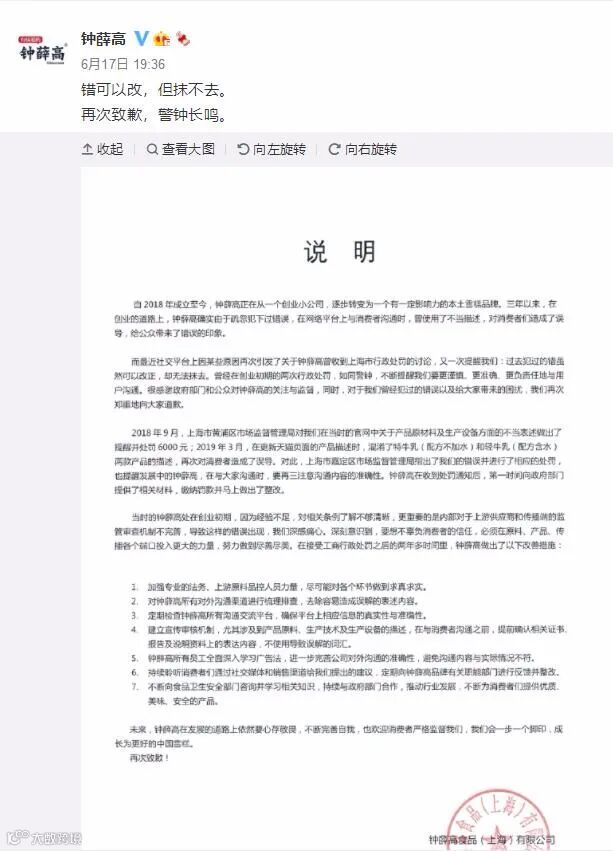 “最近社交平台上因某些原因再次引发了关于钟薛高曾收到上海市行政处罚的讨论,又一次提需我们:过去犯过的错虽然可以改正,却无法抹去。曾经在创业初期的两次行政处罚,如同警钟,不断提醒我们要更谨慎、更准确、更负责任地与用户沟通。很感谢政府部门和公众对钟薛高的关注与监督,同时,对于我们曾经犯过的错误以及给大家带来的困扰,我们再次郑重地向大家道歉。”