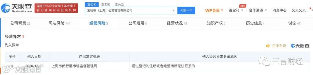 据天眼查App显示,近日,紫梧桐(上海)公寓管理有限公司列入经营异常名录,列入日期为2020年12月22日,作出决定机关为上海市闵行区市场监督管理局,列入经营异常名录原因为“通过登记的住所或者经营场所无法联系的”。