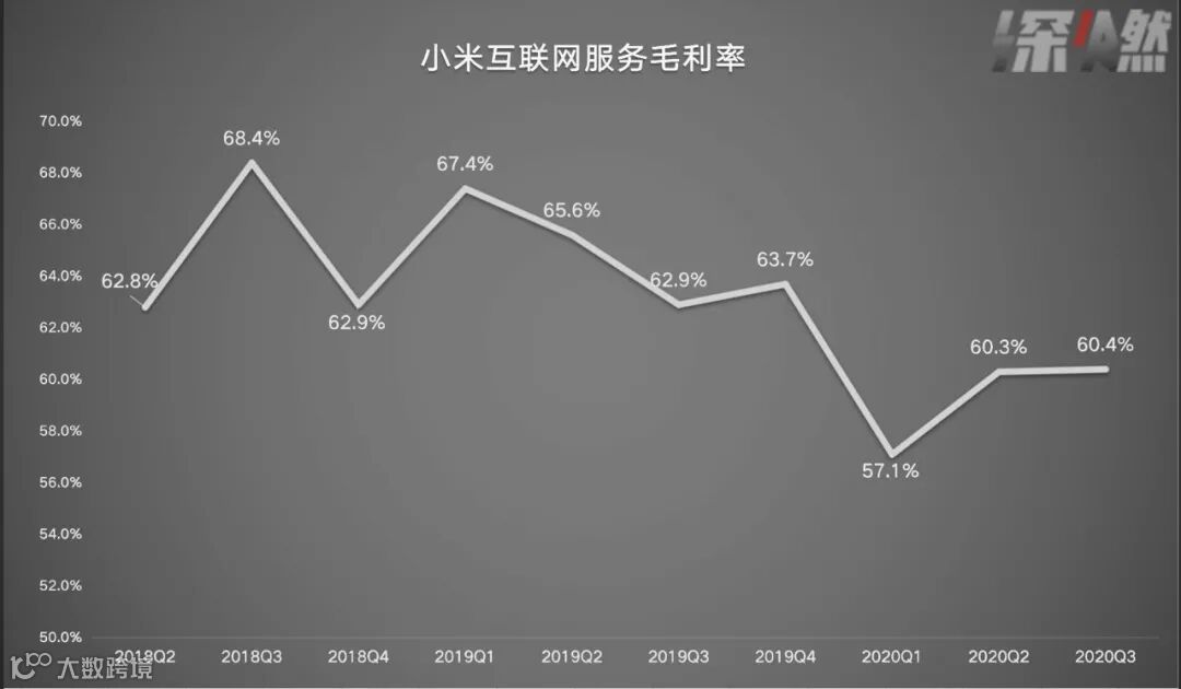 营收占比保持10%左右的小米互联网服务业务收入58亿元,毛利率一直保持在60%左右,远高于其他版块,还算平稳。